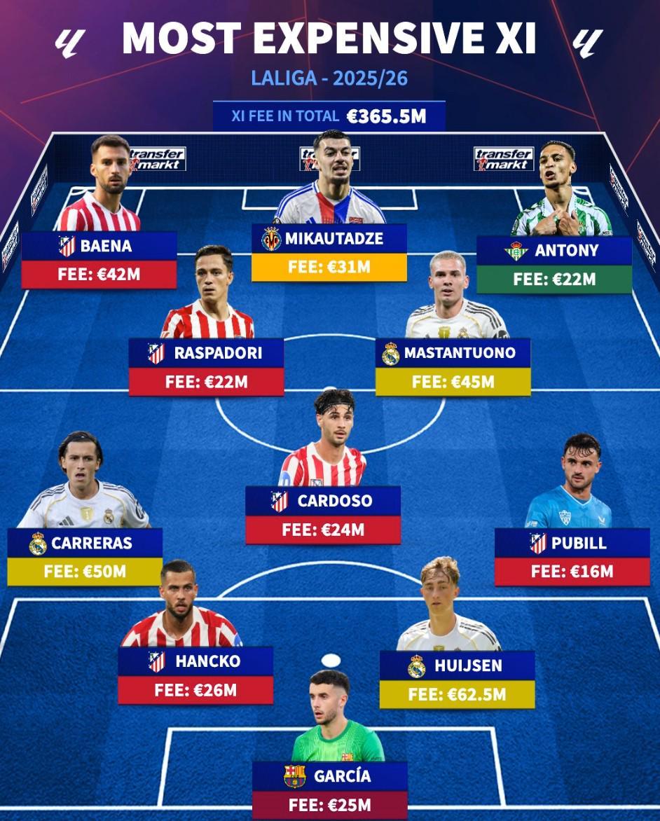 北京时间9月4日,德转列出了今夏西甲俱乐部引援的最贵11人阵容,马德里竞技5人入选,皇家马德里3人,巴塞罗那1人,永久转会皇家贝蒂斯的安东尼在列。